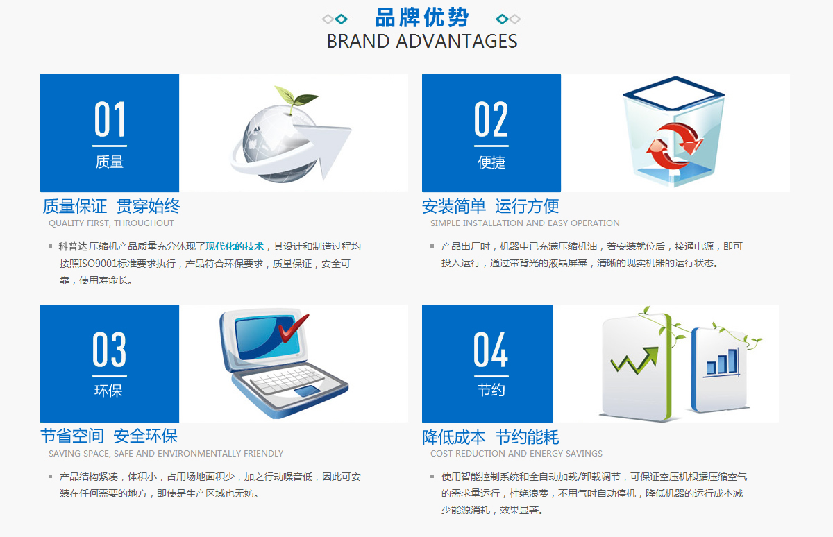 福州科普達機械有限公司,以ISO9001國際標準化質(zhì)量認證體系整裝,確保為每一個用戶提供價值領(lǐng)先的壓縮空氣系統(tǒng)和技術(shù)服務(wù),堅持創(chuàng)造空氣壓縮機領(lǐng)域的高端品質(zhì)和高端價值!推出全系列高品質(zhì)的節(jié)能變頻空壓機、雙螺桿式空壓機、活塞式空氣壓縮機以及壓縮空氣成套設(shè)備和系統(tǒng)服務(wù)。 科普達將以質(zhì)量求生存,以科技創(chuàng)新求發(fā)展,以現(xiàn)代化管理求效益,堅持出精品、造品牌、創(chuàng)優(yōu)質(zhì)、守信譽,以客戶為上帝的宗旨,專注打造中國壓縮機領(lǐng)域中的航空級企業(yè)。福州科普達機械有限公司,以ISO9001國際標準化質(zhì)量認證體系整裝,確保為每一個用戶提供價值領(lǐng)先的壓縮空氣系統(tǒng)和技術(shù)服務(wù),堅持創(chuàng)造空氣壓縮機領(lǐng)域的高端品質(zhì)和高端價值!推出全系列高品質(zhì)的節(jié)能變頻空壓機、雙螺桿式空壓機、活塞式空氣壓縮機以及壓縮空氣成套設(shè)備和系統(tǒng)服務(wù)。 科普達將以質(zhì)量求生存,以科技創(chuàng)新求發(fā)展,以現(xiàn)代化管理求效益,堅持出精品、造品牌、創(chuàng)優(yōu)質(zhì)、守信譽,以客戶為上帝的宗旨,專注打造中國壓縮機領(lǐng)域中的航空級企業(yè)。>>更多